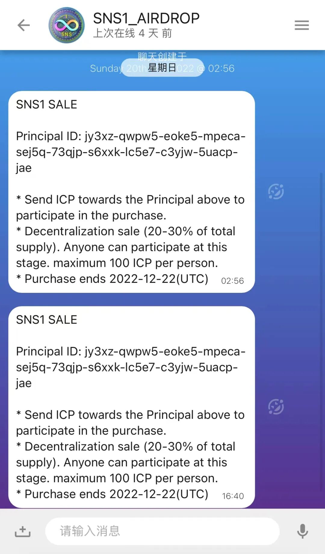 请注意,参与去中心化销售将仅在 NNS UI 中可用,我们不会在其他任何地方要求 ICP,因此如果 NNS UI 之外的任何人要求您提供 SNS-1 令牌的 ICP,请小心。友情提醒:以下在 OpenChat 出现的消息为骗人信息,请不要相信和上当,OpenChat 也在自己的 Twitter 上做了说明。![]()