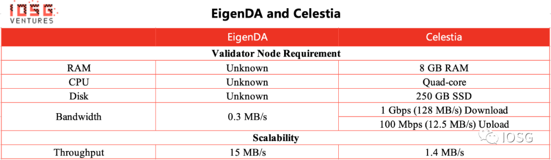 由于 Celestia 本身仍然作为 Layer1,需要对 Data Blob 进行广播和共识,这样一来实际上对网络的全节点有着很高的要求(128 MB/s 下载和 12.5 MB/s 上传),而实现的吞吐量却未必高(1.4 MB/s)。