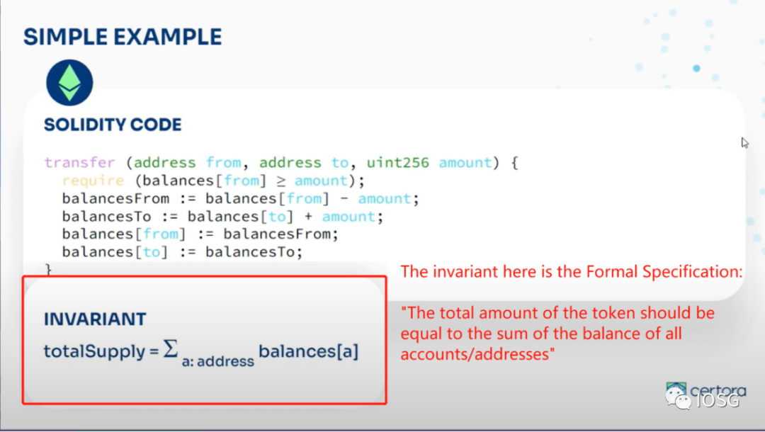 这里关于形式化验证再多说一句,形式化验证是用数学方法去验证程序的正确性——程序的实现与程序员的意图相符,最终证明项目的系统是Bug Free的。或者换句话说,形式化验证像是一种更全面的“testing”,它理论上会包含所有可能的输入和状态,这是testing无法做到的(如下图例子所示转账合约中有overflow bug,如果用testing需要测试者输入一个极大的值才能找出,但是形式化验证者会通过“total amount of the token = sum of the balance of all addresses”的数学逻辑来找出overflow bug)