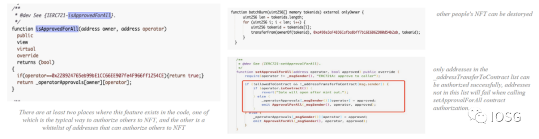 案例:Bob在某网站mint了一个NFT,两天后发现不翼而飞。因为攻击者在NFT代码植入了某些特征,可以授权他人进行 NFT交易或可以破坏他人的 NFT,无法挂单等。