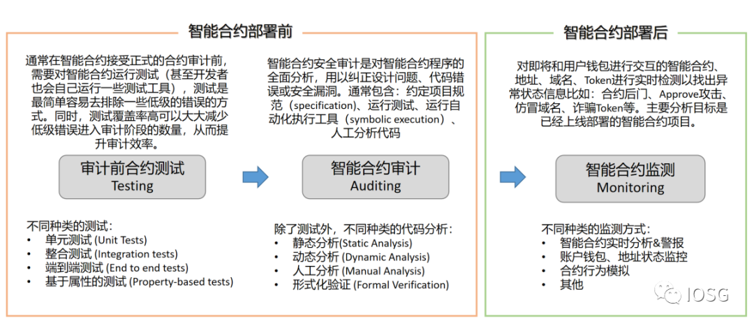 如果我们把链上智能合约从开发>>部署至区块链网络>>运行看成是一个完整生命周期的话,针对智能合约的安全分析分为:针对合约部署前(在区块链网络正式上线运行前)的分析、合约部署后的分析,这大致涵盖了:测试、审计、监测三大类目,每个类目下面又有各种类型的分析方式和相应的工具(如下图)。PS:智能合约的审计覆盖面会从合约部署前到部署后(合约升级审计)