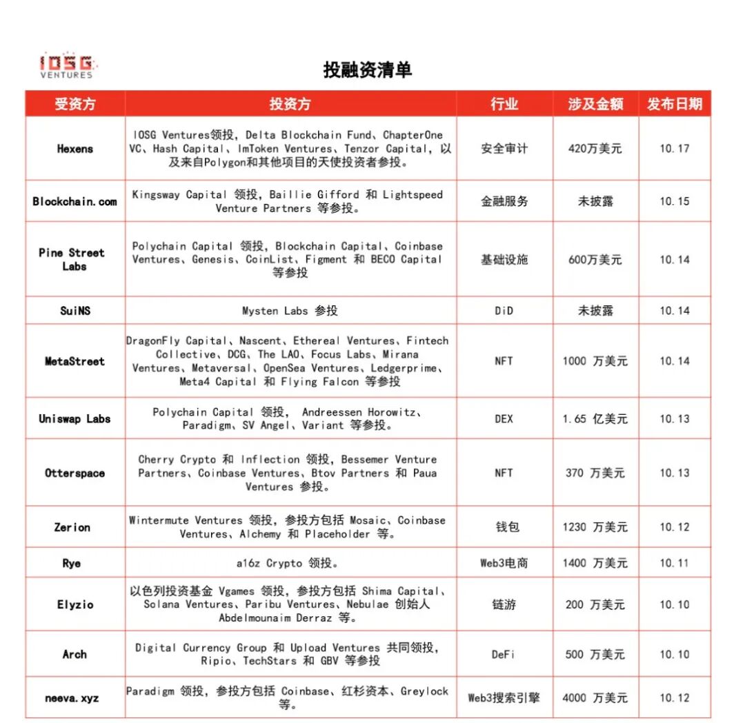 NFT 抵押品流动性和扩展解决方案 MetaStreet 完成 1000 万美元融资,DragonFly Capital、Nascent、Ethereal Ventures、Fintech Collective、DCG、The LAO、Focus Labs、Mirana Ventures、Metaversal、OpenSea Ventures、Ledgerprime、Meta4 Capital 和 Flying Falcon 等参投,所筹资金将用于创建信托、信贷和所有权产品,以促进债务并建立 NFT 行业的债务基础设施。Uniswap Labs 以 16.6 亿美元估值完成 1.65 亿美元 B 轮融资,Polychain Capital 领投