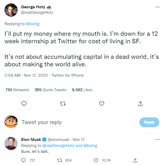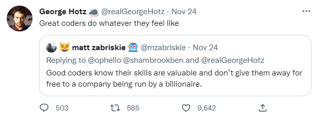 经过一轮又一轮的裁员,Twitter 大批骨干离职。有人戏称:现在 Twitter 办公室里只剩下两个最「硬核」的程序员了。另外一个则是 33 岁的 George Hotz,一个周薪 2000 美元的 Twitter 实习生。这位实习生的年龄着实大了一点儿,并且缺乏前端相关的经验,不得不从了解 GraphQL 开始,开始写些 JavaScript,从头开始一点点学习 Twitter 使用的编程语言 Java 和 Scala,他甚至在网络上直播自己如何弄明白 Twitter 是如何运行的[1]。这样的人怎么可能入得了 Elon Musk 的法眼,逆行加入 Twitter 呢?原因很简单,George Hotz 是一位超级技术大牛,网络上随处可见他的神奇经历。2007 年 8 月 21 日,当时 17 岁的 George Hotz 在自己博客宣布成功破解 iPhone,手机不再局限于 AT&T 网络,而是支持其他 GSM 网络,并在博客上发布了详细的解锁过程和视频,最终这部破解的 iPhone 换了一部跑车和三部新的 iPhone,让他在黑客圈子里声名鹊起。2009 年,他又开始解锁 PlayStation 3,后来被 Sony 起诉,最终因为黑客圈最大组织 Anonymous 施予的强大压力下和 Hotz 和解。2014 年 7 月,他加入 Google 的 Project Zero,短暂工作后退出。2015 年,专注于驾驶辅助技术,在网上免费发布了他的自主驾驶代码「openpilot」,声称可以用最小的成本做出个更好的自动驾驶技术。这给特斯拉带来了巨大威胁,Elon Musk 在 2015 年就想「招安」他,让他来特斯拉做自动驾驶,后来因为种种原因谈崩,George Hotz 自己成立了一个做自动驾驶的公司 comma.ai,因此成为了 Tesla 的对手。前段时间他还在点评 Tesla 发布会时,表示对其机器人产品的不屑。George Hotz 肯定是不缺工作也不缺钱的人,为什么要在这个时候加入 Twitter 呢?可能是他感受到 Elon Musk 和他是一类人,他喜欢混乱和挑战,他最近一个多月才开始频繁发推,并且开始体会到社交网络的乐趣。也可能因为他没经过 996 的毒打,很想体验一把鸡血的高强度推特工作。当那封名为A fork in the Road的美国版奋斗者邮件发出后,Geroge Hotz 评论到:This is the attitude that builds incredible things. Let all the people who don’t desire greatness leave.