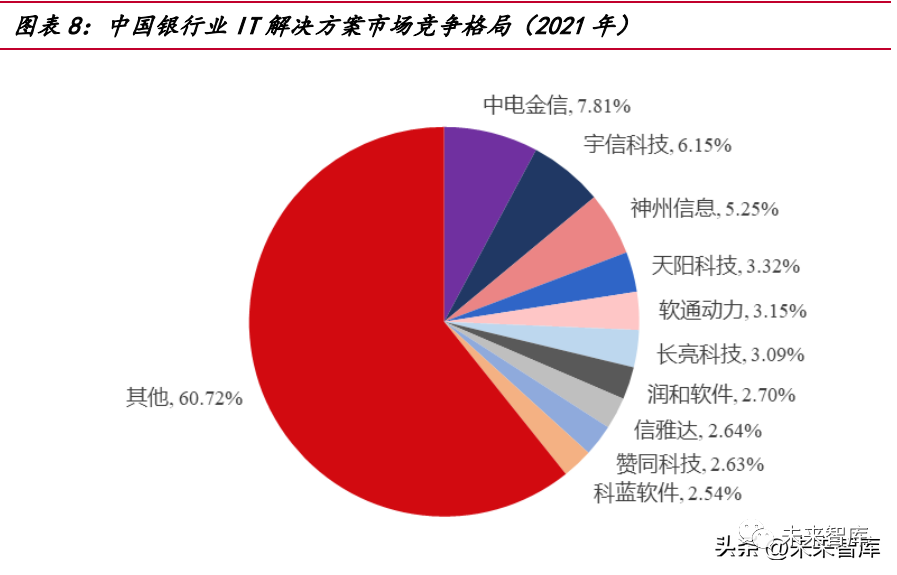细分产品类型较多、产品标准化程度较低、厂商差异化竞争等因素是造成竞争格 局分散的主要原因。(1)细分产品类型较多:中国银行业 IT 解决方案可以分为基础 业务、数字化业务、渠道及客户体验、管理风控及合规四大类,如基础业务又可以细 分为核心系统、信贷操作、中间业务、金融市场业务、支付与清算等小类,细分产品 类型较多,需求较复杂。(2)产品标准化程度较低:根据中国银保监会披露,截至 2022年 6 月底,全国共有 4599 家银行业金融机构。各个银行在开展业务、技术水平、发 展方向等存在一定差异,因此所需产品也存在一定差异,需要进行客户化开发。(3) 厂商差异化竞争:各个厂商在不同细分领域中实现差异化竞争。根据赛迪顾问发布的 《2021 中国银行业 IT 解决方案市场份额分析报告》,2021 年,中电金信在基础业务 类、管理与监管类两个大类以及支付清算、远程银行、风险管理、商业智能、客户关 系管理五个子解决方案市场占有率均排名第一;宇信科技在信贷管理系统、互联网贷 款、网络银行三个子解决方案市场占有率排名均第一;神州信息在核心业务、渠道管 理、开放银行三个子解决方案市场占有率排名均第一。