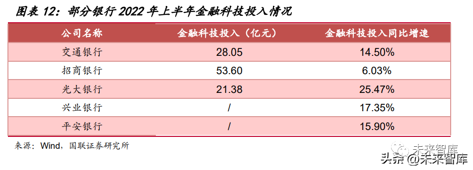 2022 年上半年银行金融科技投入持续增长。在分布式架构转型、自主可控建设、 场景金融开拓、数字人民币试点等背景下,银行数字化持续推进,金融科技投入持续 增长。部分银行在 2022 年半年报中披露了金融科技投入情况,其中光大银行金融科 技投入同比增长 25.47%;兴业银行、平安银行同比增长超 15%。