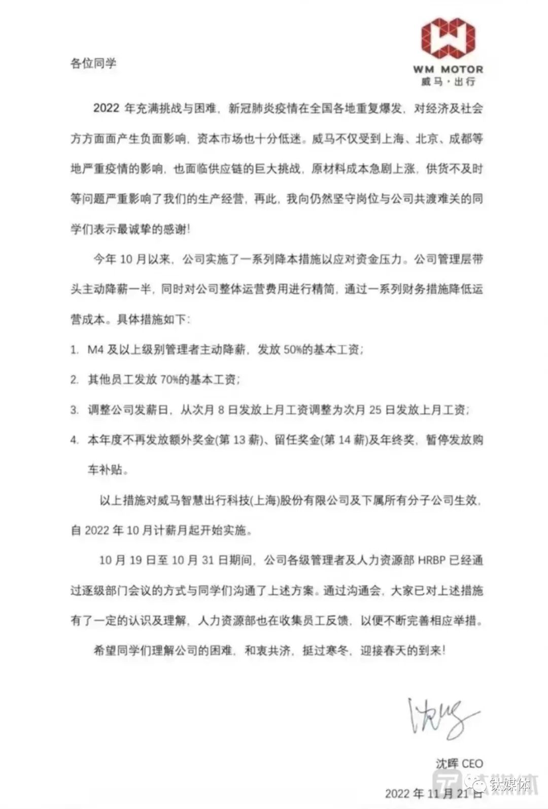 内部信显示,为了应对资金压力,威马汽车将通过一系列财务措施降低运营成本,包括管理层带头主动降薪一半;其他员工发放70%的基本工资;将公司发薪日从次月8日发放上月工资调整为次月25日发放上月工资;本年度不再发放额外奖金(第13薪)、留任奖金(第14薪)及年终奖,暂停发放购车补贴。