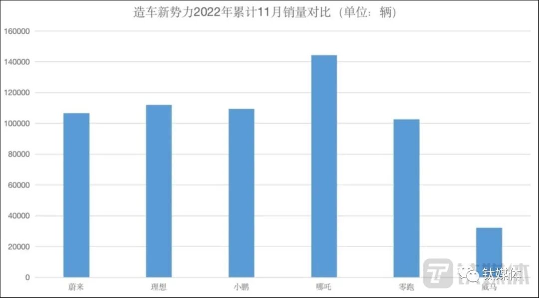 产品缺乏竞争力,威马的销量也被甩开不止一个身位。公开数据显示,威马汽车 2022年前11月销量仅有32302万辆,近三个月销量分别为 5005辆、1117辆、3018辆。作为曾经与蔚小理比肩的新势力车企,这一销量表现可以说十分惨淡。
