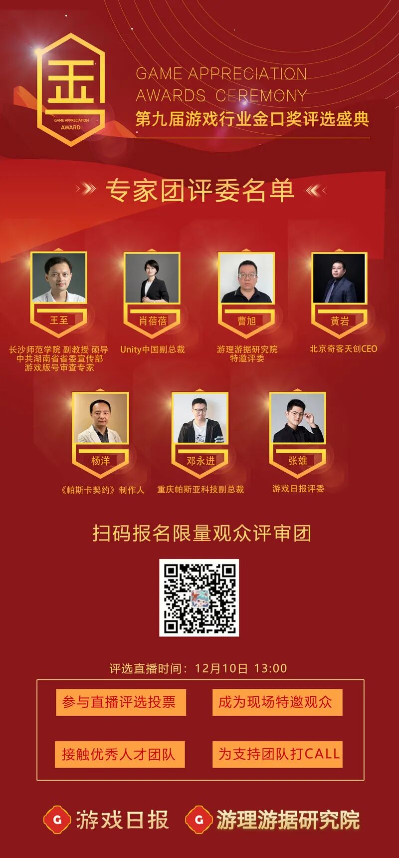 同时,最终决赛评选开设了观众评审投票环节。报名参与线上直播评选投票并通过审核的特邀观众,将进入专属通道参与线上直播投票。参与投票不仅可以支持自己喜欢的入围作品,同时还有机会聆听来自业界大佬的专业点评,和参赛选手同频互动。有意报名观众评审团的朋友可点击评委名单下方海报二维码或添加游戏日报宝姐(youxiribao666)报名。