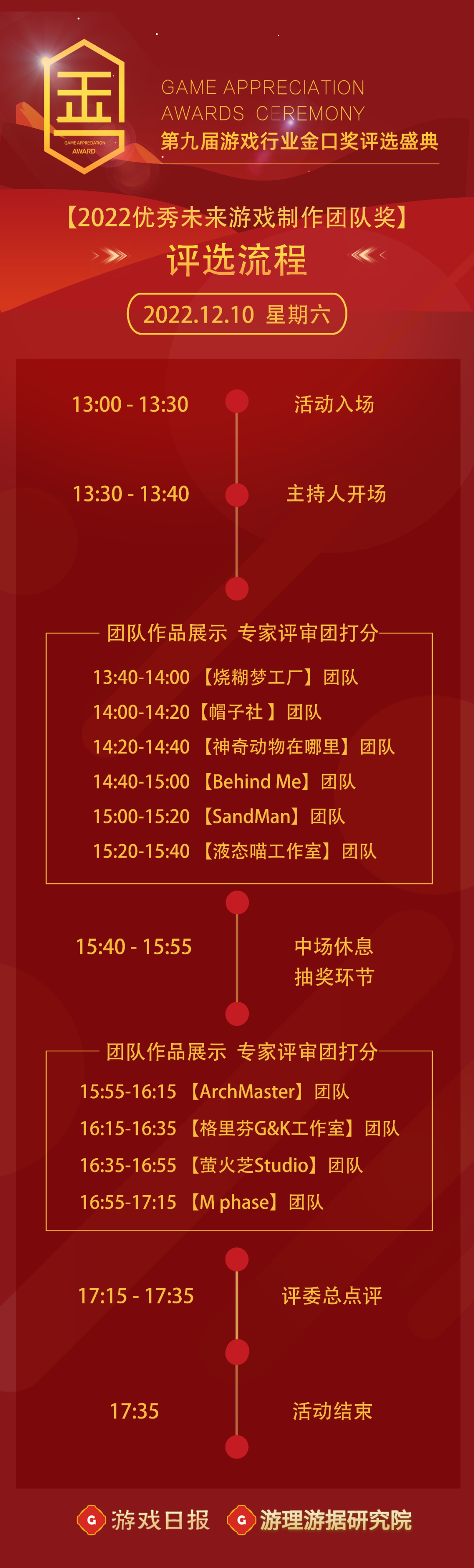 2022年12月10日,由游戏日报和游理游据研究院主办的第九届游戏行业金口奖【2022年优秀未来游戏制作团队奖】决赛将正式举行,此前已经公布奖项入围名单(点击此处查看)。本着公平、公正、公开的原则,决赛采取“专家评审团打分+观众直播投票”的方式进行综合评选,决赛流程详情见下图: