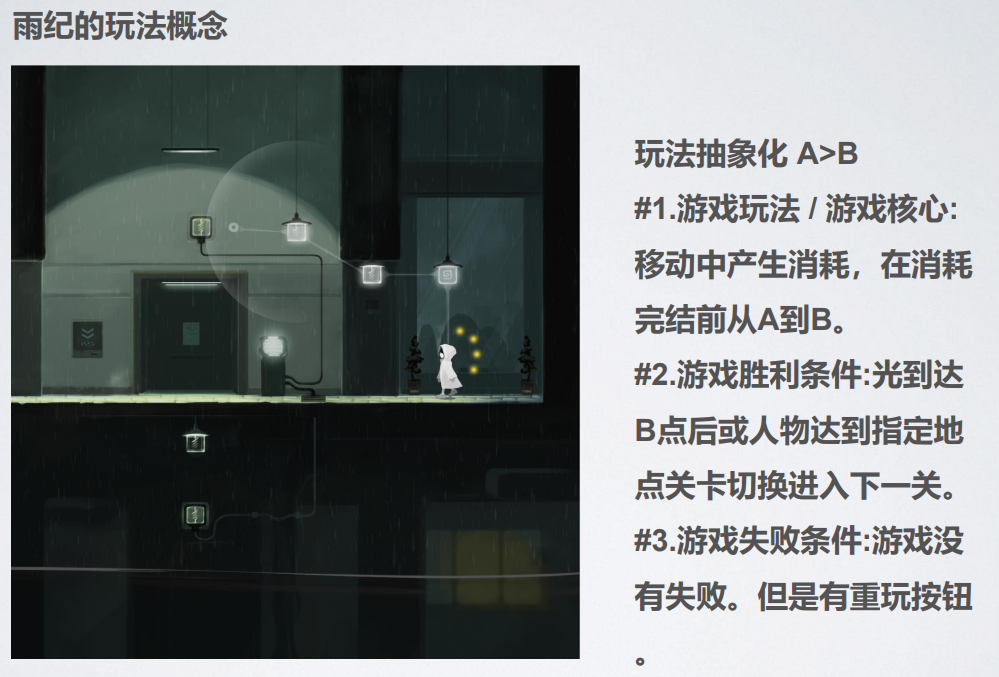 如何去设计游戏中的玩法概念?陈虹曲以《雨纪》的玩法设计举例,表示在设计具体玩法时,可以将玩法进行抽象化设计,先确认玩法核心,其次根据这个核心来设计胜利条件(达成目的所需要的条件),最后设定游戏失败条件,三步组合起来便可以完成一个玩法的构建。
