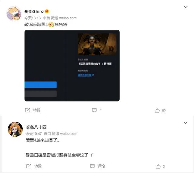 “敲碗等暗黑4。急急急。”“暗黑4越来越香了。暴雪口碑是否能打翻身仗全靠这了。”