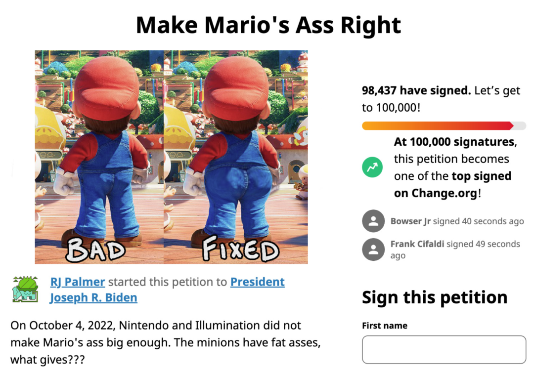 有了如此广泛的群众基础,便也不难理解为何玩家们会对马力欧的屁股如此执着。这个历史悠久的游戏系列的忠实粉丝无法接受自己心爱的角色惨遭削弱,他们开始集体呼吁任天堂关注马力欧的屁股问题,希望能在银幕上欣赏到那颗完美的翘臀,事情闹大了之后,知名游戏媒体IGN也下场凑热闹,帮着大家一起为马力欧发声。