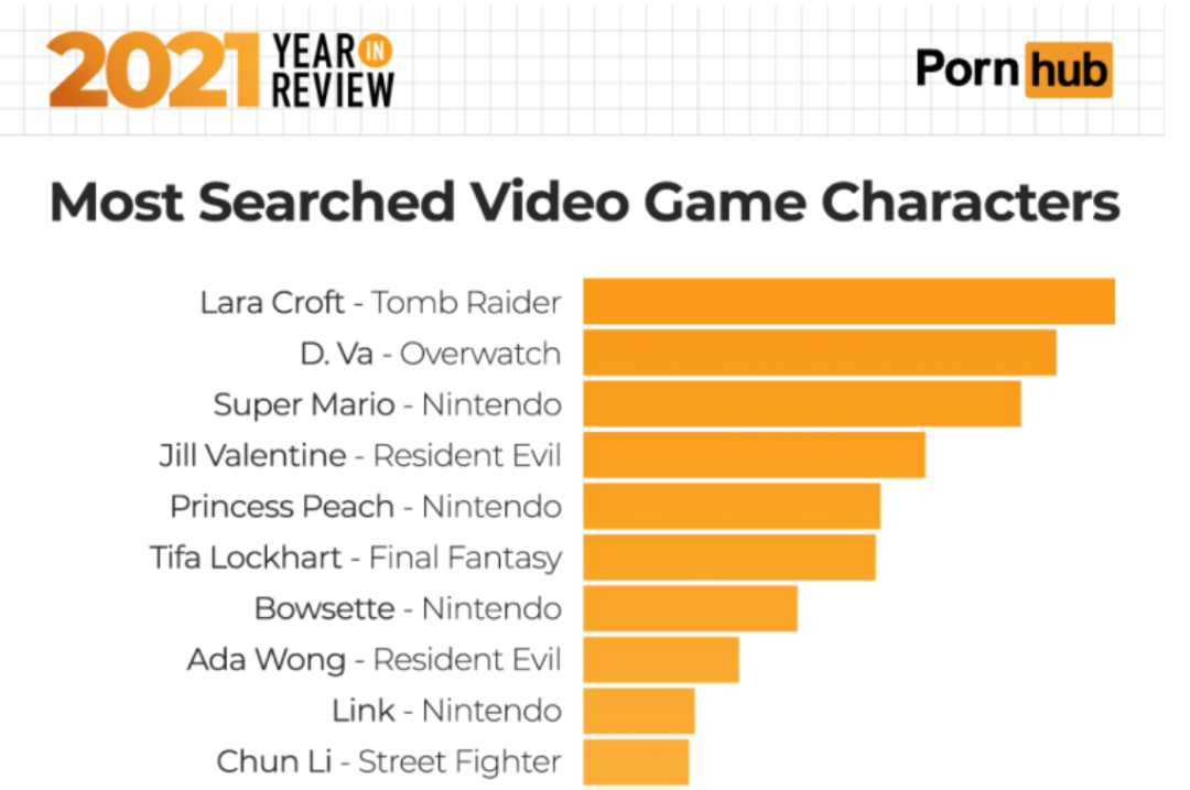 根据知名成人视频网站Pornhub2021年度统计报告显示,在电子游戏这个“人才辈出”的领域,今年41岁的马力欧大叔依旧宝刀未老,顺理成章地拿下了游戏角色搜索量榜单的第三名,作为对比,大众女神蒂法屈居第六,马力欧的色气程度可见一斑。