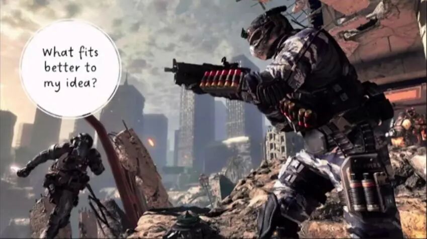 找到了这些之后,你必须找到一个行之有效的主题,一个可以为游戏想法和玩法带来加成的主题,也就是适合你想法的东西,比如我们要做一款FPS,什么主题最适合这个想法?显然是军事题材,这是任何人都能理解的,这里面有好人、坏人、枪支,我知道有装备、两个小队,我知道我要击败或者击杀其他团队。