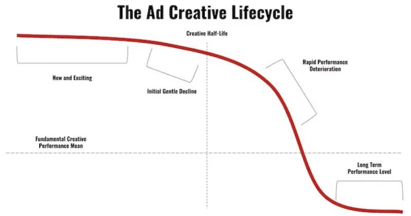 投放的素材是奠定投放广告成功的一个极其重要的组成部分,但对素材进行生产和测试的成本可能是巨大的。归根结底,素材生产和测试流程的目的是建立一个生产节奏,在上线的素材达到下图所示的性能拐点之前,产出新的、可行的创意素材。