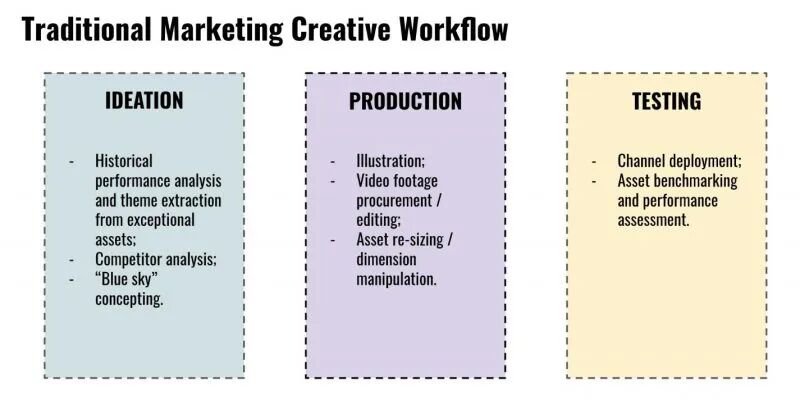 这一过程是不断循环的,而且在理想情况下是增量的。但是,素材生产过程中的增量优化概念可能会让人困惑。我的感觉是,团队在评估他们的素材生产工作流程的有效性时,往往不太关注流程的改进,而是关注他们的广告素材的主观品质,而这些品质很难、甚至没法确定价值。这些品质的例子有:审美风格、产品定位、叙事风格、主题、内容的时间顺序(对于视频而言)等。