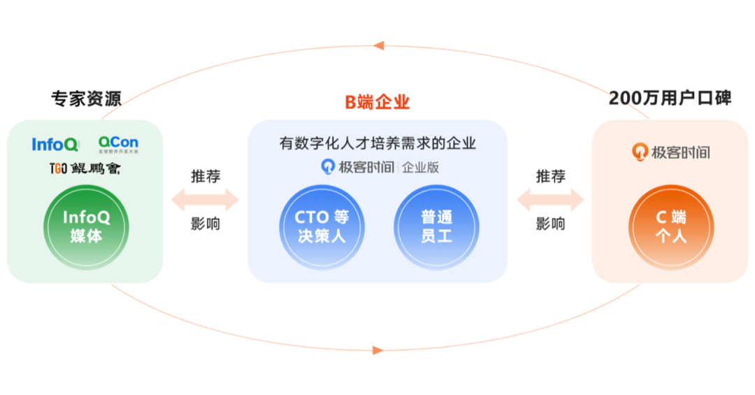 霍太稳表示,B 端和 C 端业务是相互关联、相互促进的过程。「在 2019 年,极客时间 App 有一百多万名用户。有些用户觉得课程不错以后,希望他的团队成员也能学习,但是原来 C 端的模式太被动,需要一个企业端。基于这一诉求,极客邦科技研发了极客时间企业版。而很多企业员工刚开始不知道极客时间 App ,在企业端学习后,也会去注册个人账号,形成一个闭环。所以我们现在做 C 端业务也是为了发展 B 端业务,帮助企业大规模培养数字化人才,同时也帮助数字人才匹配到好的企业。C 端的课程,B 端也可以共用,专家的影响力也可以最大化,由此吸引更多的专家到我们平台,专家池的变现效率更高。而随着数字化人才培养的蛋糕越来越大,无论 C 端业务还是 B 端业务都会做得越来越大。」