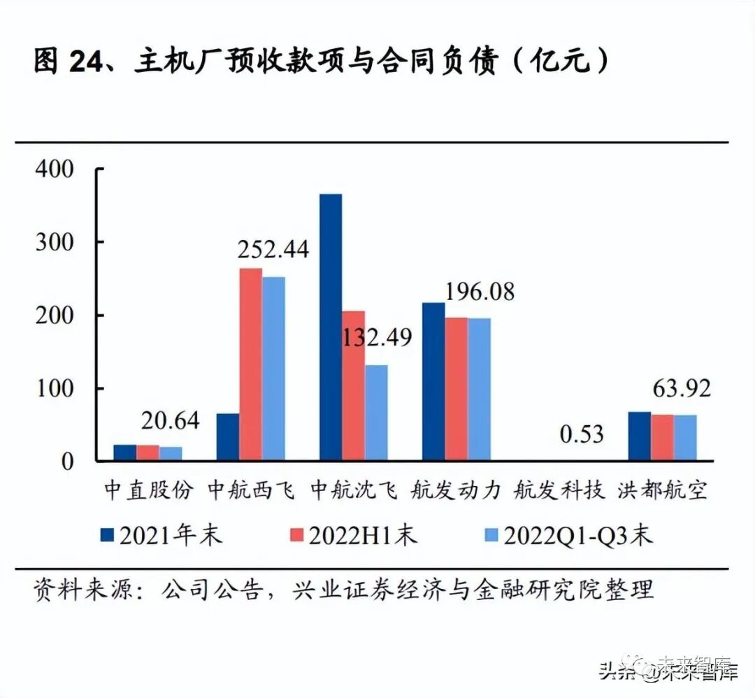 截至 2022Q3 末,86 个军工标的合同负债(包括预收账款)之和为 879.36 亿元, 较年初减少 17.95%,较 2022H1 末减少 12.96%。其中航空领域 737.74 亿元(较 2022 年初-11.00%,较 2022H1 末-11.21%,下同)、航天领域 38.49 亿元(-12.97%、 -7.09%)、舰船领域 3.76 亿元(-25.55%、-18.72%)、地面兵装领域 52.18 亿元(- 59.77%、-35.82%)、通用配套领域 28.41 亿元(-31.23%、-13.43%)、电子元器件 领域 18.79 亿元(-16.46%、-2.36%)。单独统计航空领域主机厂标的中航沈飞、中航西飞、洪都航空、中直股份、航发 动力、航发科技合同负债(包括预收账款),6 家主机厂期末合同负债(包括预收账款)合计 666.09 亿元,较年初减少 10.20%,占航空领域总金额 90.29%,其中 中航沈飞 132.49 亿元(较年初-63.74%,下同)、中航西飞 252.44 亿元(+283.20%)、 洪都航空 63.92 亿元(-6.66%)、中直股份 20.64 亿元(-11.73%)、航发动力 196.08 亿元(-9.86%)、航发科技 0.53 亿元(-52.75%)。中航西飞合同负债大幅提升表明 “十四五”期间重点军机型号需求已明确落地。