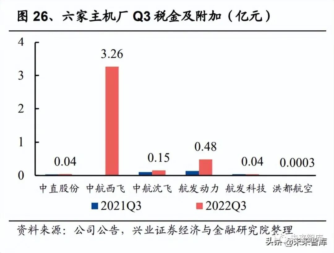 由于航天领域资产证券化率较低,我们以资产证券化率较高的航空领域中六家主 机厂(中直股份、中航西飞、中航沈飞、航发动力、航发科技、洪都航空)为例, 其 2022Q1-Q3 税金及附加分别为0.13/3.72/0.36/0.87/0.11/0.01 亿元,分别同比 +0.01/+3.34/+0.08/+0.45/-0.001/+0.002 亿元,合计 5.20 亿元,同比增加 3.88 亿元;2022Q3 税金及附加分别为0.04/3.26/0.15/0.48/0.04/0.0003 亿元,分别同比 +0.01/+3.26/+0.05/+0.35/+0.001/-0.0004 亿元,合计 3.98 亿元,同比增加 3.67 亿元。
