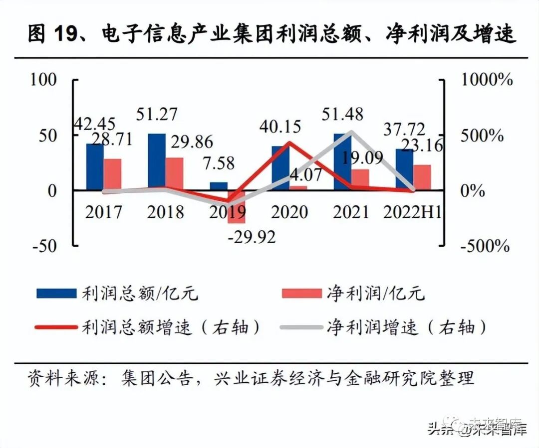 据集团 2022 年半年报,2022 年上半年电子信息产业集团实现营业总收入 1316.33 亿元,同比增长 1.96%;利润总额 37.72 亿元,同比减少 4.60%;净利润 23.16 亿 元,同比增长 12.38%。