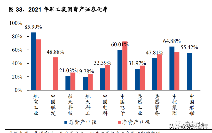 据中国证券报,2022 年 5 月 18 日,国务院国资委党委委员、副主任翁杰明在深 化国有控股上市公司改革争做国企改革三年行动表率专题推进会上表示:要继续 加大优质资产注入上市公司力度,集团公司要系统梳理未上市和已上市资源,结 合实际逐步将现有未上市的优质资产有计划地注入上市公司,必要的也可单独上 市;要稳妥探索符合条件的多板块上市公司分拆上市,支持有利于理顺业务架构、 突出主业优势、优化产业布局、促进价值实现的子企业分拆上市。要盘活或退出低效无效上市平台。截至 2021 年底,十大军工集团中,航空工业集团资产证券化率居于首位,总资产 口径和净资产口径费别为 85.99%、75.68%;航天科技、航天科工处于相对较低水 平。