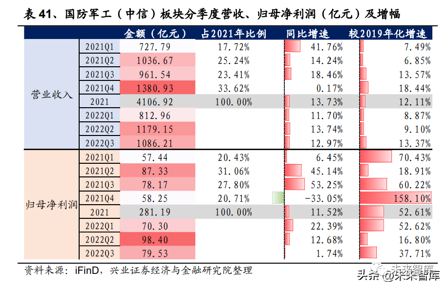 据已披露财务数据的各军工集团年度工作报告,“十四五”初期,各集团业绩均保 持持续稳定增长,2022H1 净利润增速均高于收入增速。