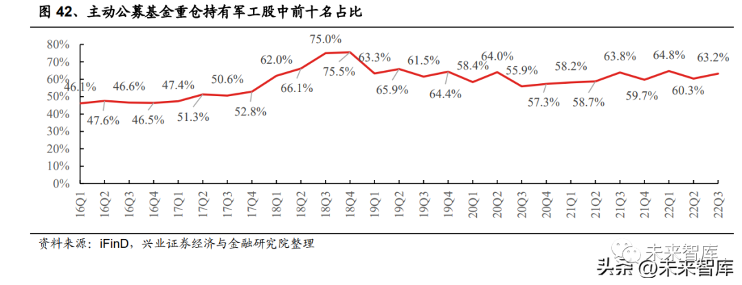 2016-2017 年,主动公募基金重仓持有的军工股持仓总市值 top10 市值占比基本维 持在 45%-50%区间。2017Q4 至 2018Q4,主动公募基金重仓持有的军工股持仓集 中度逐步提升,持仓总市值 top10 市值占比从 2017Q4 的 52.83%上升至 2018Q4 的 75.53%。2019 年至今持仓总市值 top10 市值占比维持在 55%-66%区间,2022Q3 为 63.19%。