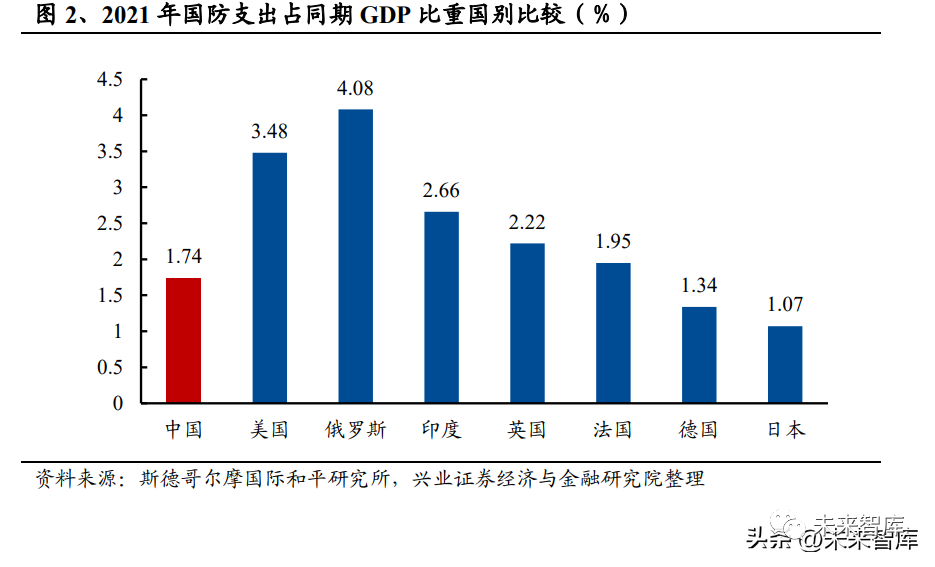 当前我国武器装备建设仍处于补偿式发展的关键时期。改革开放 42 年来的前 20 年,国家战略以经济建设为中心,国防和军队建设让位于经济发展,军费大幅压 缩,先进武器装备研发与生产受到抑制。1999 年以来,以改革开放 20 多年的经 济基础为基石,军工行业启动了高速补偿式发展的进程。我们判断,未来十年我 国国防科技工业仍将处于补偿式发展的关键时期。与世界主要国家相比,我国国防费占国内生产总值(GDP)偏低,仍有较大增长 潜力。据斯德哥尔摩国际和平研究院统计,2021 年中国国防开支占 GDP 比重为 1.74%,低于美国、俄罗斯、印度、英国和法国,高于日本和德国。俄乌冲突爆发 后,全球军备有抬升趋势;据人民网报道,在 2022 年 6 月举行的北约峰会上,北 约峰会提出到 2024 年各国国防支出占 GDP 比重达 2%的目标。