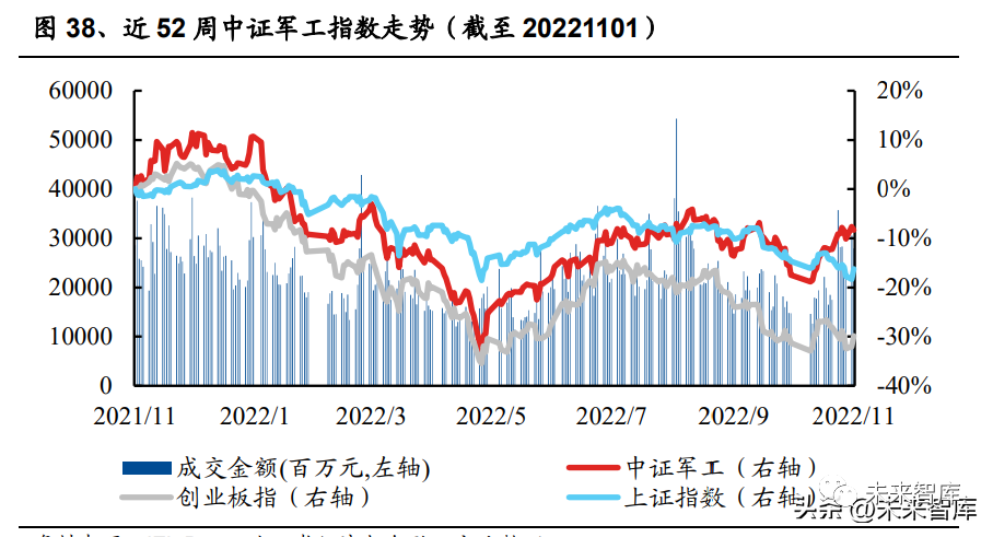 年初至今(20221101,下同),中证军工指数下跌 17.24%,跑赢上证综指 1.18%, 跑赢创业板指 12.40%,国防军工(中信)指数下跌 17.47%,在中信 30 个行业指 数中涨跌幅排名第 14 位。截至 2022 年 11 月 1 日,国防军工(中信)板块总市值 21059 亿(在 A 股中总市 值占比 2.49%),市盈率(TTM,剔除负值)54.1 倍,分别排名第 16、第 2。