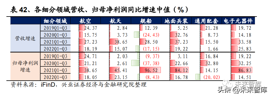 2022 年作为“十四五”第二年,装备采购需求按部就班展开,景气度维持较高水平;俄乌战争阴云下全球军备抬升;我国周边军事高压态势持续,维护统一立场 坚定,国防和军队建设刚性更强;军工行业计划性强,配套体系相对封闭,管控 有力,受疫情扰动较小,主战装备相关企业业绩兑现确定性高。展望 2023 年,军工板块投资难度相比 2020 年下半年到 2022 年显著加大:经过近 两年的演绎,“十四五”行业需求加速的认知趋于充分。超额收益或取决于更加精 细的基本面分析和业绩研判。我们沿着横向——下游细分领域、纵向——各产业链环节两个维度梳理行业增速。