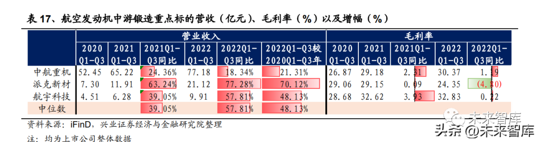 产业链中游锻造企业也显著受益于产业需求加速,代表企业有:中航重机、派克 新材、航宇科技等。3 家公司营收增速中值从 2021Q1-Q3 的 39.05%提升至 2022Q1- Q3的57.81%;Q3单季度营收中值从2021Q3的37.67%提升至2022Q3的62.64%。其中航空发动机业务占比略低的中航重机增速相对略低,军品业务占比较高的派 克新材、航宇科技增速显著提升。