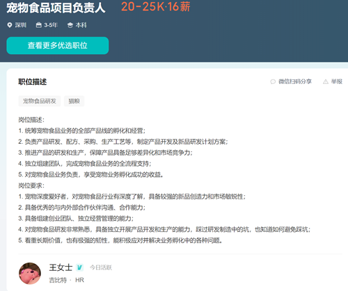 今年2月开始,吉比特开始招聘数个宠物食品相关的科学研究和管理岗,据了解宠物食品业务由雷霆CEO翟健负责。此前吉比特曾在投资者沟通平台上回应表示,宠物食品业务目前正处于早期探索阶段,具有较大不确定性。