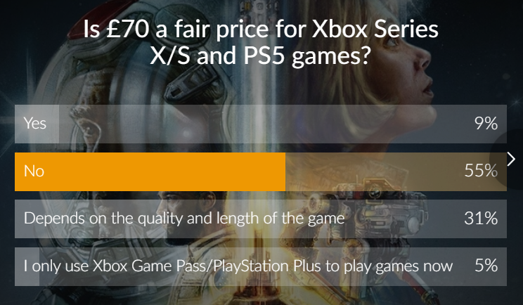 针对此事,外媒Eurogamer发起了一项玩家投票,询问玩家是否可以接受价格上调。目前投票结果如下: