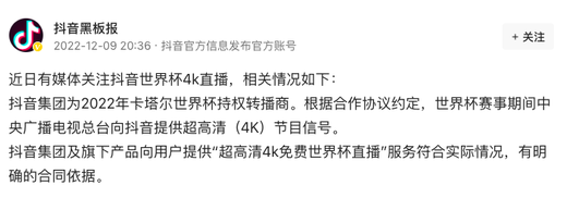 抖音回应世界杯4K直播事件,服务符合实际情况,有明确合同依据