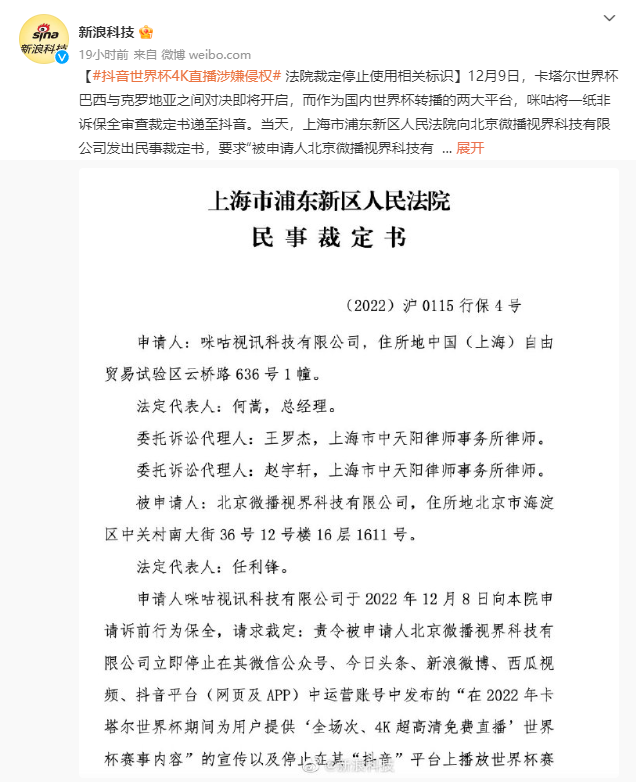 但是近日,据相关媒体报道称,因涉嫌不正当竞争,抖音世界杯4K直播被法院要求下线。对此,抖音方面回应称,抖音集团为2022年卡塔尔世界杯持权转播商。根据合作协议约定,世界杯赛事期间中央广播电视总台向抖音提供超高清(4K)节目信号。抖音集团及旗下产品向用户提供“超高清4K免费世界杯直播”服务符合实际情况,有明确的合同依据。据悉,12月9日,上海市浦东新区人民法院向北京微播视界科技有限公司发出的民事裁定书,要求“被申请人北京微播视界科技有限公司立即停止在其微信公众号、今日头条、抖音平台中发布‘在 2022 年卡塔尔世界杯期间为用户提供全场次、4K超高清免费直播世界杯赛事内容’的相关宣传以及停止在其‘抖音’平台上播放世界杯赛事时使用‘超高清 4K’标识。”而申请人咪咕方面表示,2020年12月25日,申请人与中央广播电视总台总经理室 (以下简称央广总台) 签署了《2020年度冬奥会、世界杯赛事节目版权许可和媒体合作协议》 (以下简称《合作协议》),约定双方在本协议下合作赛事的4K、8K及以上信号和VR信号在互联网和电信运营商领域所有渠道除央视外,申请人享有独家权利。许可内容包括但不限于2022年卡塔尔世界杯,包括小组赛48场、淘汰赛 (含决赛) 16场,共计64场全部比赛及其他相关活动。咪咕方面认为,被申请人在未支出成本的情况下,通过宣传等方式吸引大量用户通过其运营的网页、App等平台免费观看标识为“4K超高清”的世界杯内容,在市场上给予用户替代性选择,致使申请人遭受巨大损失。咪咕方面称已就被申请人的上述行为于2022年11月15日起持续通过邮件、平台内投诉等方式向申请人发送预警函、下线函,要求被申请人停止侵权。但截止本案申请之日,被申请人的侵权行为仍在持续。