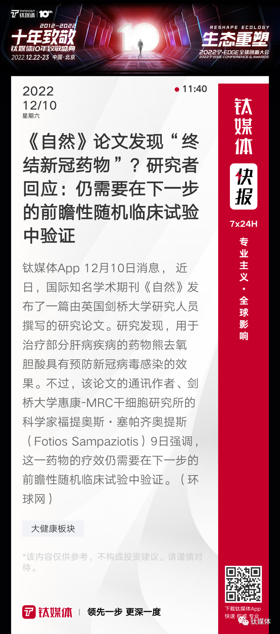 【《自然》论文发现“终结新冠药物”?研究者回应:仍需要在下一步的前瞻性随机临床试验中验证】