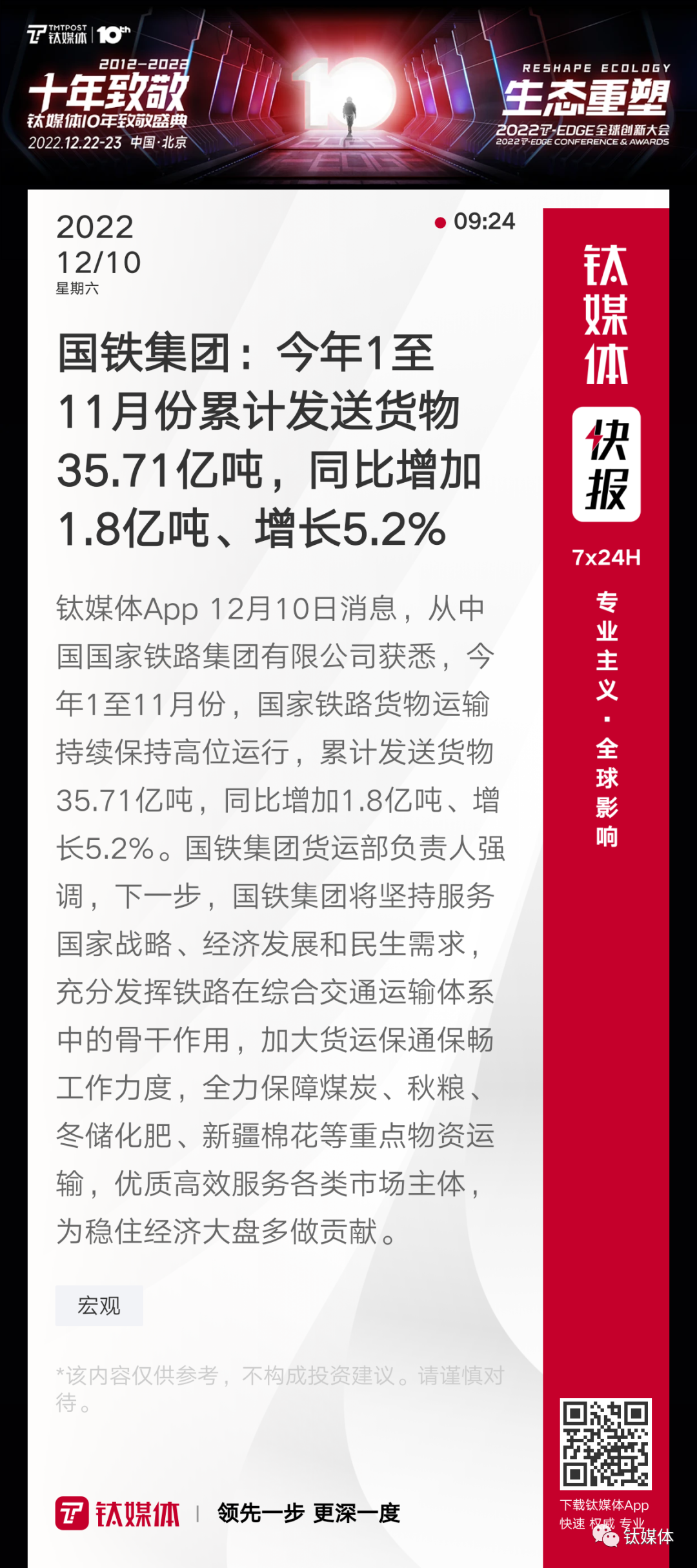【国铁集团:今年1至11月份累计发送货物35.71亿吨,同比增加1.8亿吨、增长5.2%】