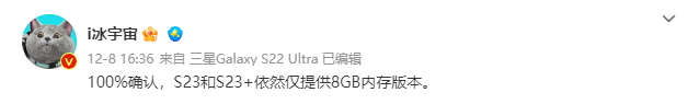 而随着发布时间的逐渐临近,更多该系列其他产品细节爆料也正在陆续出现。近日,博主@i冰宇宙 曝光了三星Galaxy S23标准版和S23+的内存信息,两款机型将依然仅提供8GB内存版本。