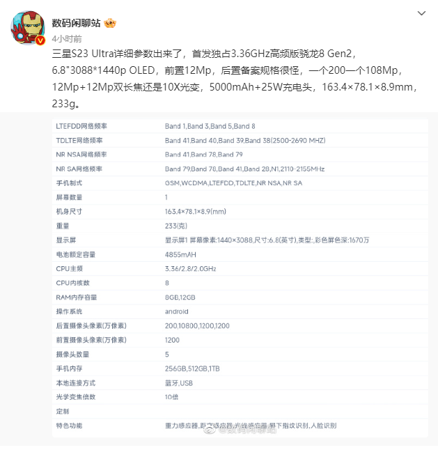 据悉,三星将首发独占3.36GHz高频版骁龙8Gen2,采用6.8英寸 3088×1440分辨率OLED显示屏,前置1200万像素自拍摄像头,后置四摄,分别是一个200万像素传感器、一个1亿800万像素传感器(据博主称有点怪,据之前数据应为2亿像素),1200万+1200万像素双长焦支持10X光变。