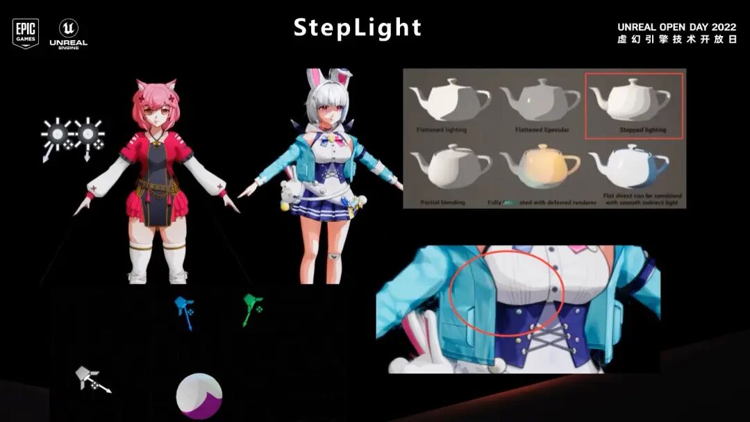 例如对皮肤材质而言,我们需要控制它的高光、暗部的颜色和两部分之间的过度。我们可以通过预积分的方式精准控制阴影过度。除了上面讲的几点以外,卡通材质的形态也是它的表现重点,建模本身也是控制材质表现的重要一环。