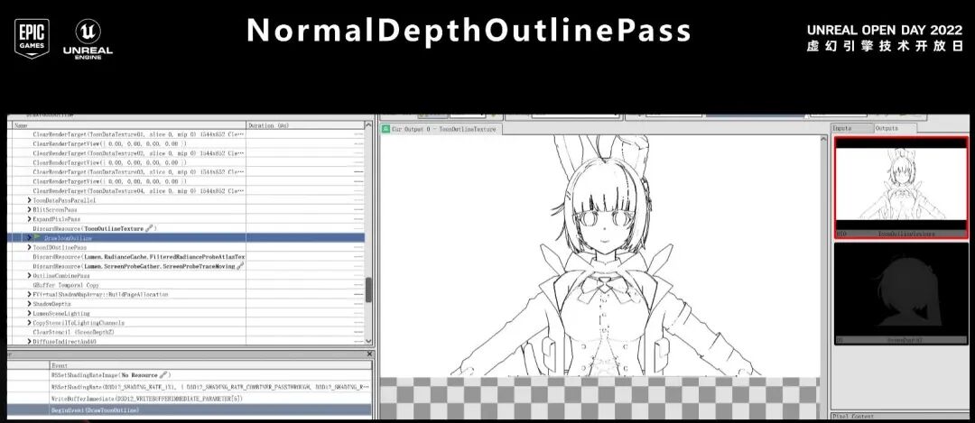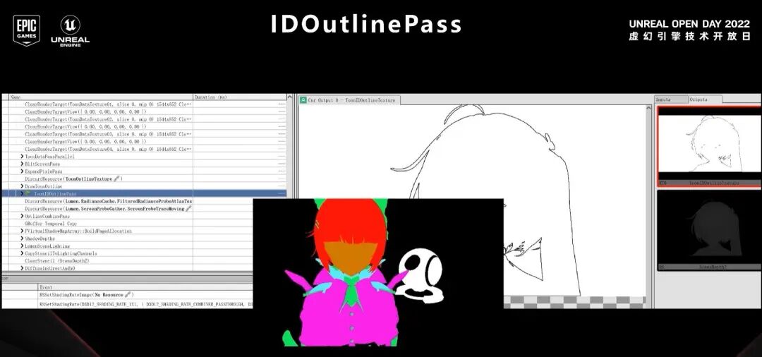 接下来是屏幕空间勾线,它主要是利用很多屏幕空间数据来查找边缘来得出,因为Unreal Engine是以延迟渲染为主的渲染管线,所以这里我们有非常多的屏幕空间数据可以拿出来利用,例如深度、法线以及各种ID,都可以作为作为屏幕空间勾线的数据源。