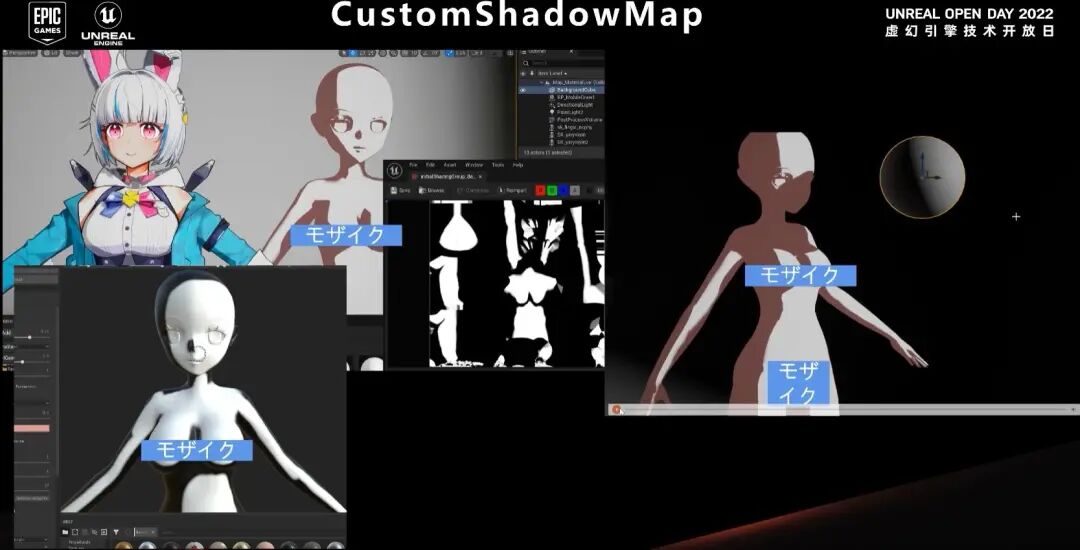 除了自阴影和ShadowMap之外,我们还需要增加一些控制阴影的手段,我这里增加了一个CustomShadowMap的方法来对阴影进行高自由度控制,艺术家可以在SubstancePainter或其他绘图软件里对阴影进行绘制,我的卡通渲染管线会对CustomShadowMap进行读取,然后把它整合到整个渲染管线当中。CustomShadowMap可以和SelfShadow以及VirtualShadowMap进行完美兼容,这里可以看一下效果: