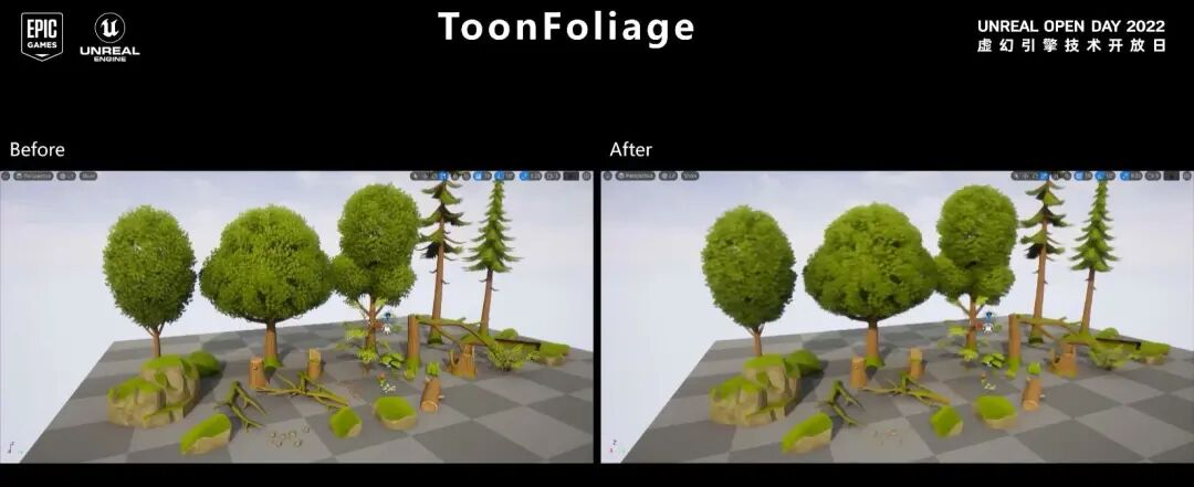 对于植被,处理卡通植物除了平滑法线这样常规的手段以外,我们还需要同样对植被进行Kuwakara算法,不过植被的Kuwakara需要一个directional的算子对植被进行水彩化过滤。这里可以看到前后对比。