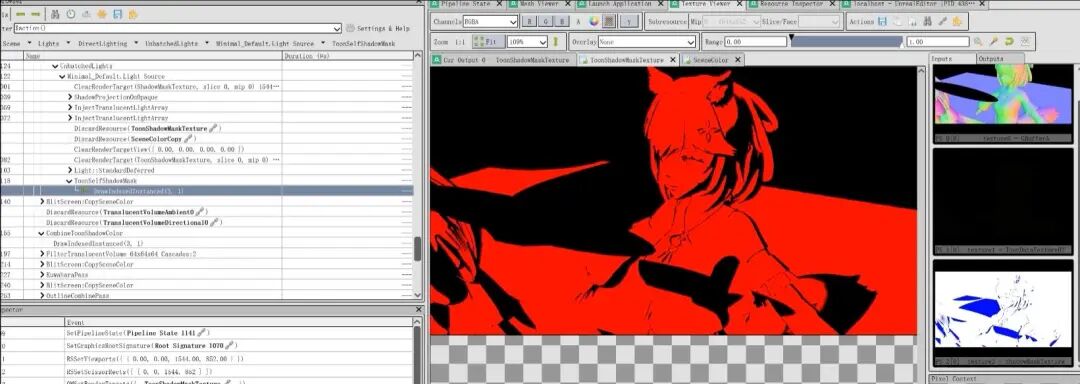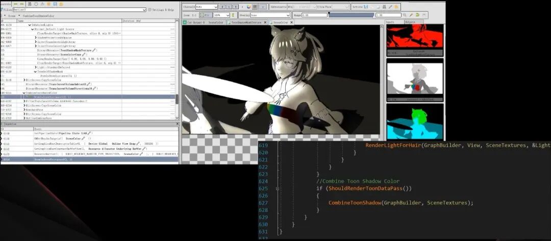 完成了阴影生成以后,还需要考虑阴影颜色,前面我们提到卡通材质的阴影颜色也是非常重要的一环,所以我们要对材质的阴影颜色进行严格控制,为此我渲染了一个单独的RT来存储模型表面各个部分的阴影颜色。