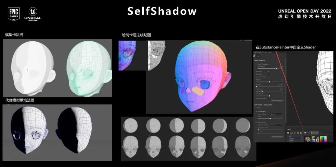第一个部分是自阴影(SelfShadow),因为我们需要兼容虚幻引擎5的多光源,所以只能选择纠正法线的方法来纠正模型表面的自阴影。模型表面自阴影纠正方法常用的有三种,第一种是模型手动卡线布线、卡顶点,第二种是代理模型烘焙法线,第三种是手绘法线贴图来纠正自阴影。