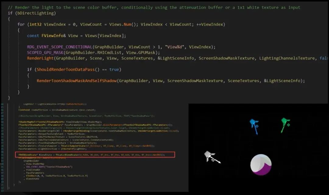 再下一步,我们来处理SelfShadow和VirtualShadowMap的合并,我们只需要在灯光(lighting pass)的最后把shadowmap提取出来,然后再和SelfShadow进行合并即可。