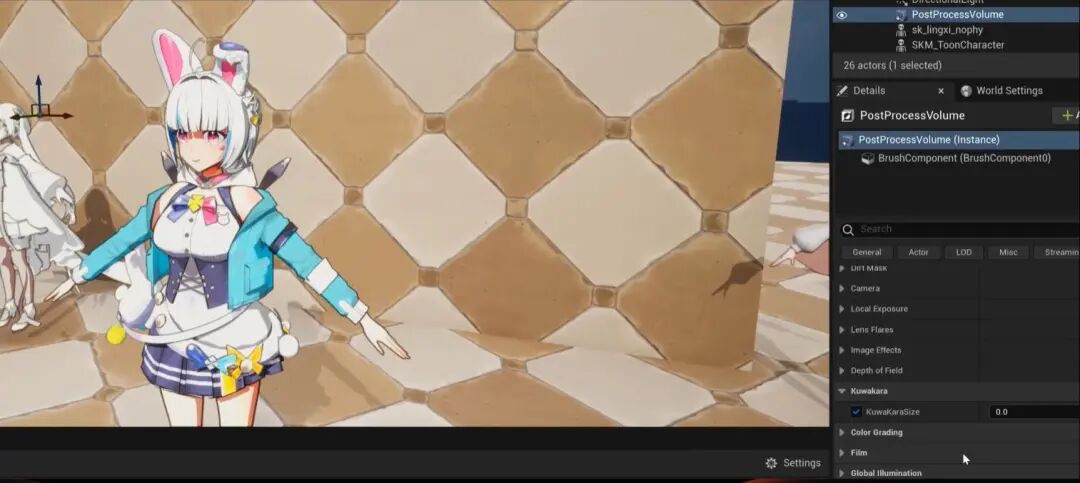 这里我们需要注意的是,人物是分开处理的,人物和场景使用的是不同的Kuwakara权重,场景可能要强一点,并且场景的Kuwakara强度会根据深度变化而变化。人物的话,我们直接在材质上指定一个固定Kuwakara权重。