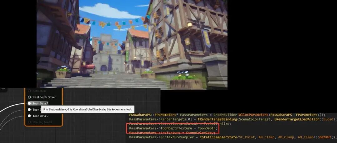 对于虚幻的Base Pass而言,已经被原有的光照模型占满了数据,所以我们的卡通渲染管线需要增加一个ToonGBuffer,来存储卡通渲染管线需要的GBuffer数据。我的卡通渲染管线当中,ToonGBuffer由四张GBuffer组成:ToonDataA存储世界模型的顶点法线,ToonDataB在R通道存储阴影偏移、G通道存储Kuwakara权重、B通道存储CustomShadowMap、A通道存储边缘检测的勾边阈值。
