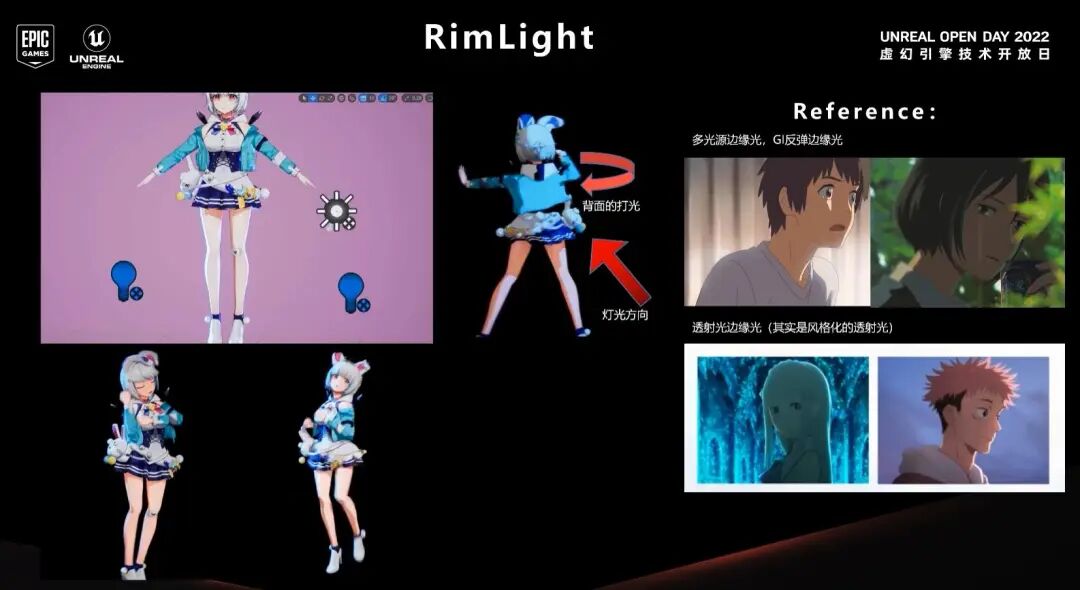 当我们建立一个科学的多光源光照体系以后,很多效果就可以很自然的出现,不需要我们再去trick。之前举了一个额发阴影的例子,现在我们处理完多光源以后,边缘光同样也适用这个情况,我总结了边缘光的几种类型,第一种是多光源造成的边缘光,第二种是GI反弹造成的边缘光,第三类是光线投射产生的边缘光。我们的卡通渲染管线现在支持多光源,所以如果我想要边缘光,只需要多打一盏灯就可以实现。