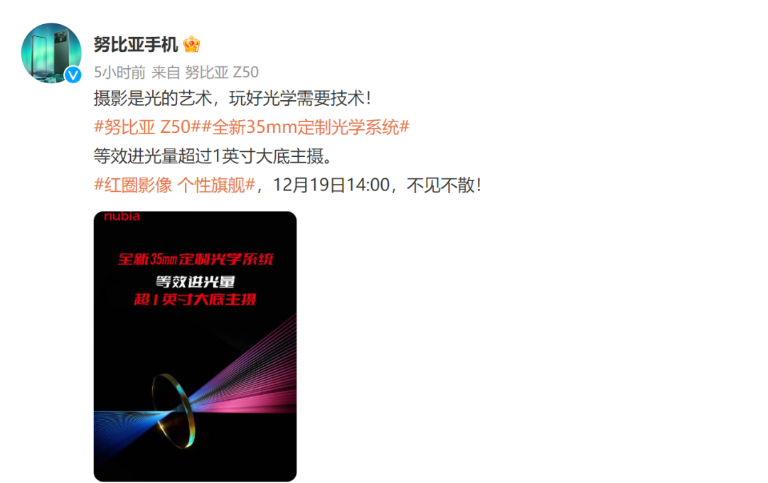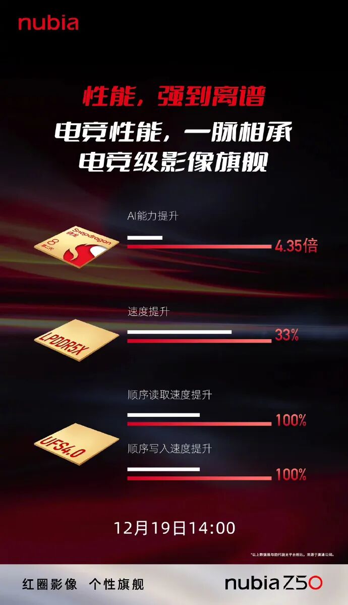 随着第二代骁龙8移动平台的正式发布,12月会有一批搭载该平台的新旗舰手机将要发布。今日,努比亚手机官方正式宣布,将于12月19日14:00发布努比亚Z50,号称“红圈影像 个性旗舰”。